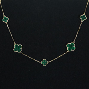 Collar de cadena fina en plata baño oro, destaca por sus delicados tréboles de cuatro hojas en malaquita, símbolo de buena suerte y prosperidad. Su diseño minimalista y sofisticado la convierte en el complemento perfecto para cualquier ocasión, ya sea para un look diario como un evento especial. Ideal para llevar sola o combinar con otras joyas.